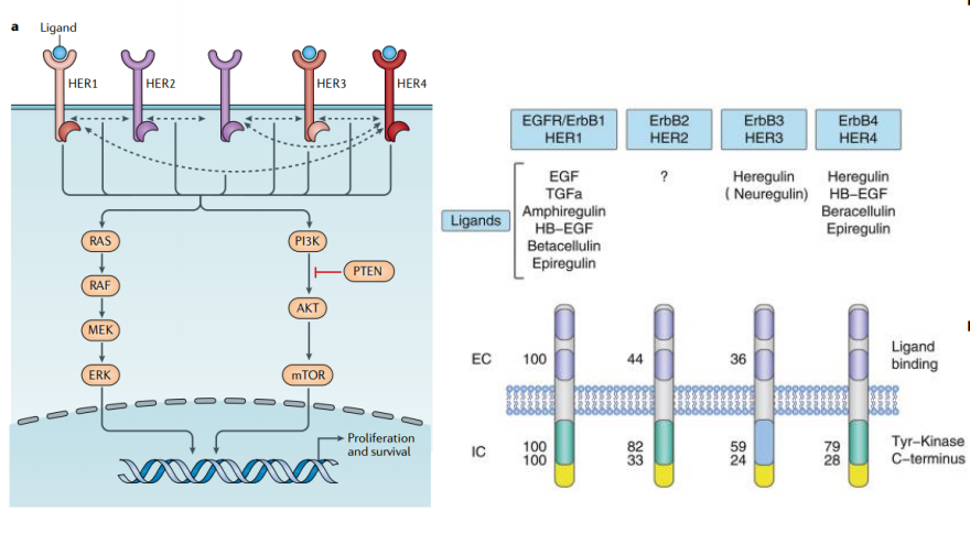 ErbB家族:表皮生长因子受体家族 (epidermal growth factorreceptor family, ErbB family) 包括erbB1(EGFR,HER1),erbB2(又称HER2),erbB3(HER3)和erbB4(HER4)四个家族成员,其在细胞生长、发育及分化过程中起着重要作用。这些受体均位于细胞膜表面, 具有相似的结构: 一个与配体结合的胞外区、一个单跨膜α螺旋跨膜区和一个由胞内近膜区、酪氨酸激酶催化结构域及富含酪氨酸起调节作用的C端尾部区域组成胞内区。