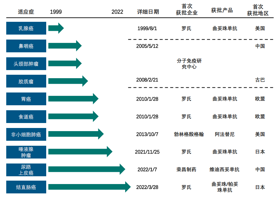 1999年,全球第一款HER2靶向治疗药物——罗氏制药的曲妥珠单抗首次在美国获批上市,适应症为乳腺癌。