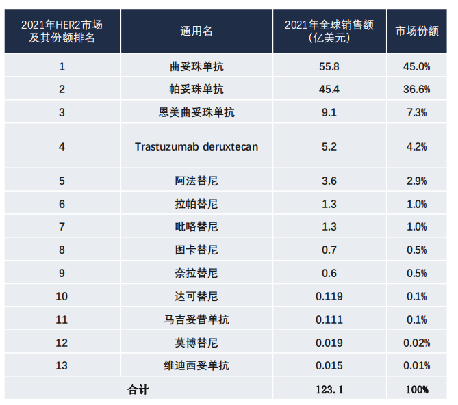 2021年全球HER2靶向抑制剂市场主要药物及其市场份额