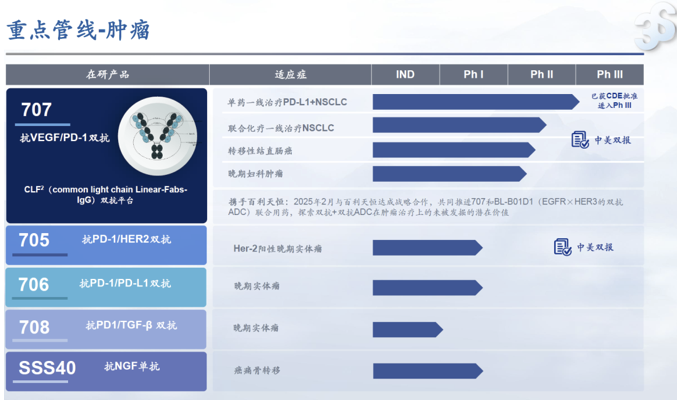今年4月,SSGJ-707获国家药监局突破性治疗药物认定,适应症为一线治疗PD-L1表达阳性的局部晚期或转移性非小细胞肺癌(NSCLC)。此前,SSGJ-707已获得FDA的IND批准。目前,SSGJ-707单药一线治疗非小细胞肺癌适应症已进入III期临床阶段,联合化疗一线治疗非小细胞肺癌适应症处于临床II期阶段、转移性结直肠癌适应症处于临床II期阶段,晚期妇科肿瘤适应症处于临床II期阶段。