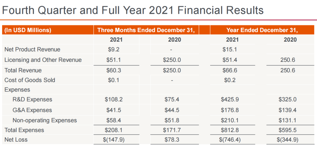 2021年,Apellis全年总收入6660万美元,其中产品收入1510万美元,均来自Empaveli(pegcetacoplan)的商业销售业绩,与Sobi合作相关的里程碑和许可收入共5140万美元。值得一提的是,Empaveli(pegcetacoplan)的用药群体大多数是先前使用C5抑制剂治疗的群体,由Ultomiris(ravulizumab)转换而来的患者占这些使用过C5抑制剂治疗群体的75%,患者依从率超过95%。公司全年研发费用为4.259亿美元,主要是由于与Beam的研究合作增加了7500万美元支出,以及其他项目的研发支出;一般及行政支出为1.768亿美元。公司全年净亏损7.464亿美元。