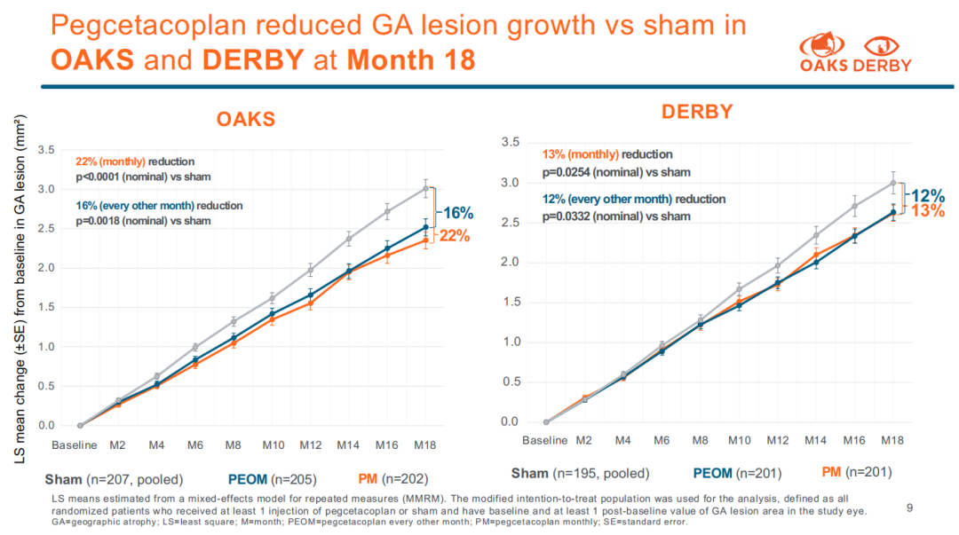 针对GA适应症,Apellis在2022年视觉与眼科研究协会年会(ARVO2022)上公布了3期DERBY试验(入组621名患者)和OAKS试验(入组637名患者)的详细18个月治疗数据,结果显示玻璃体内(每月或隔月)注射Pegcetacoplan可持续减少GA患者眼内病变生长,且显示出良好的安全性,患者中心凹外和中心凹病变生长实现持续且具有临床意义的减少。Pegcetacoplan是首个在大规模3期试验中显著减缓GA进展的创新药物。