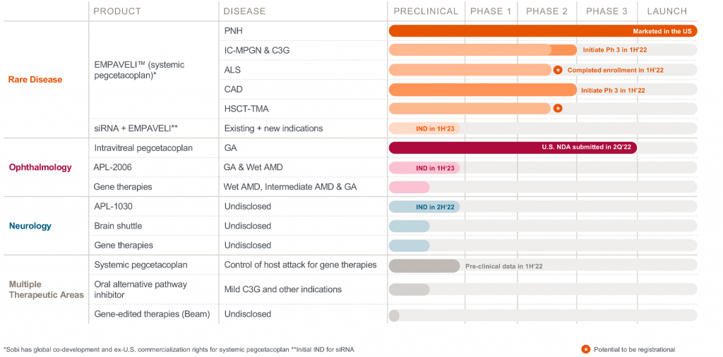 CAD是一种严重、慢性、罕见的血液疾病,影响美国和欧洲约10500人,患者可能患有慢性贫血,且血栓形成的风险增加,如中风;HSCT-TMA是一种罕见的血液疾病,可能是骨髓移植的致命并发症。Pegcetacoplan针对CAD和HSCT-TMA适应症的研究目前由Sobi主导。2022年初,Pegcetacoplan用于HSCT-TMA患者的2期试验完成首例患者给药,Sobi预计将于2022年第二季度启动该药用于CAD患者的3期试验。