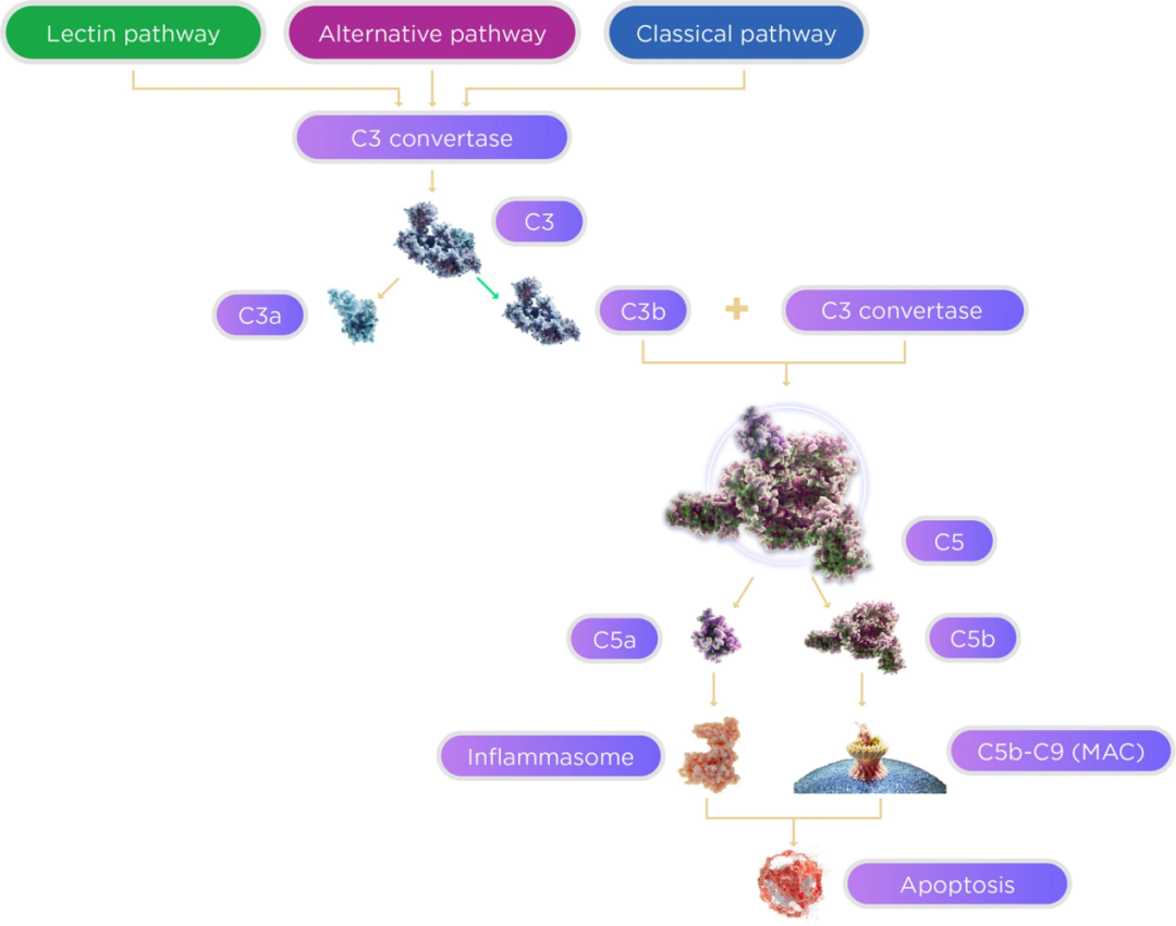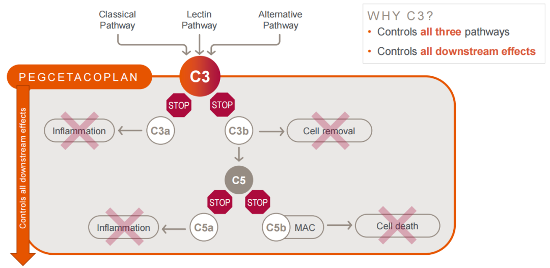 Apellis公司目前的开发工作主要根植于补体系统中的C3蛋白,C3蛋白处于补体级联反应的中枢位置,是血清中含量最高的补体成分,可对补体系统的全部3条途径(经典途径、凝集素途径和替代途径)以及所有的下游效应进行调控。对C3蛋白水平进行抑制或可对补体依赖性自身免疫和炎症性疾病具有广泛的控制作用。
