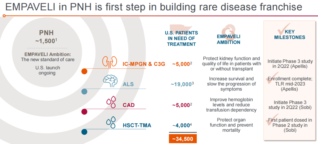 目前,Empaveli(pegcetacoplan)已在美国、沙特阿拉伯、澳大利亚获批并销售,在欧盟和英国以Aspaveli®为商品名进行销售,用于治疗阵发性睡眠性血红蛋白尿症(PNH)。此外,Apellis还构建了一个ApellisAssist系统,可为患者提供针对产品和疾病的教育、自行输液训练、保险支持,以及针对特定患者的经济援助。