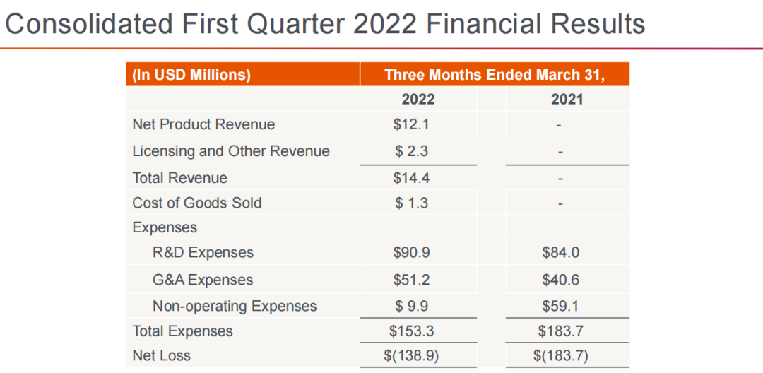 2022年Q1,Apellis总收入1440万美元,其中包括1210万美元的Empaveli(pegcetacoplan)产品收入,以及230万美元与Sobi合作相关的收入。公司第一季度研发费用为9090万美元;一般及行政支出为5120万美元。公司第一季度净亏损1.389亿美元。