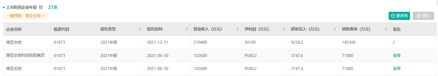2022年3月29日,维亚生物在上海召开2021年度业绩发布会。2021年维亚生物主营业务收入为21.04亿元:
