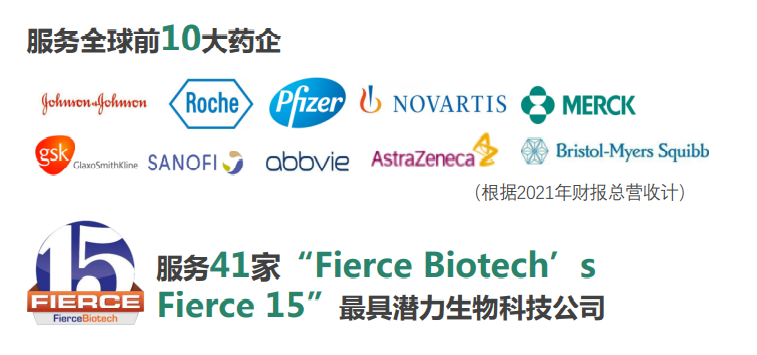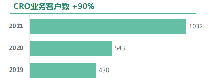 CRO业务客户数量逐年递增,2021年客户数量增至1032名,增长率90%。CRO业务服务全球前10大药企,包括辉瑞、默克等,另外还服务总计41家“Fierce Biotech’s Fierce 15”最具潜力生物科技公司。
