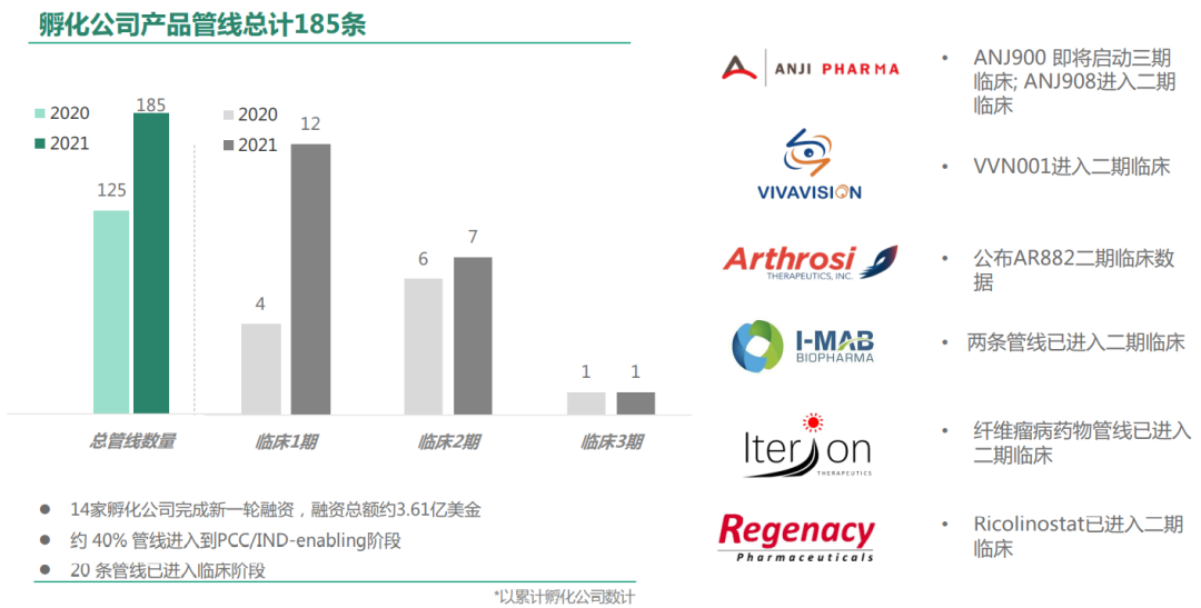 2021年,维亚生物孵化公司药物管线高速扩张,总在研管线增加至185条,其中20条管线已进入临床阶段。