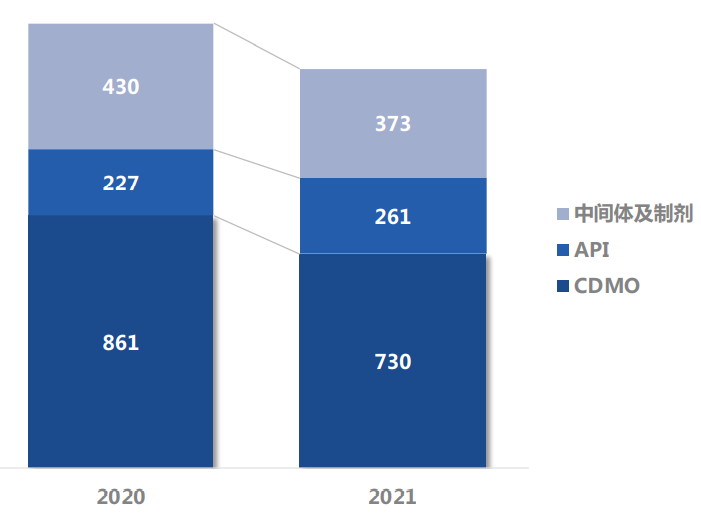 CDMO业务实现营收7.3亿元;两大主要业务齐驱并进,各自占总营收比重为35%;中间体及制剂业务营收3.73亿元,占比18%;API业务营收2.61亿元,占比12%。