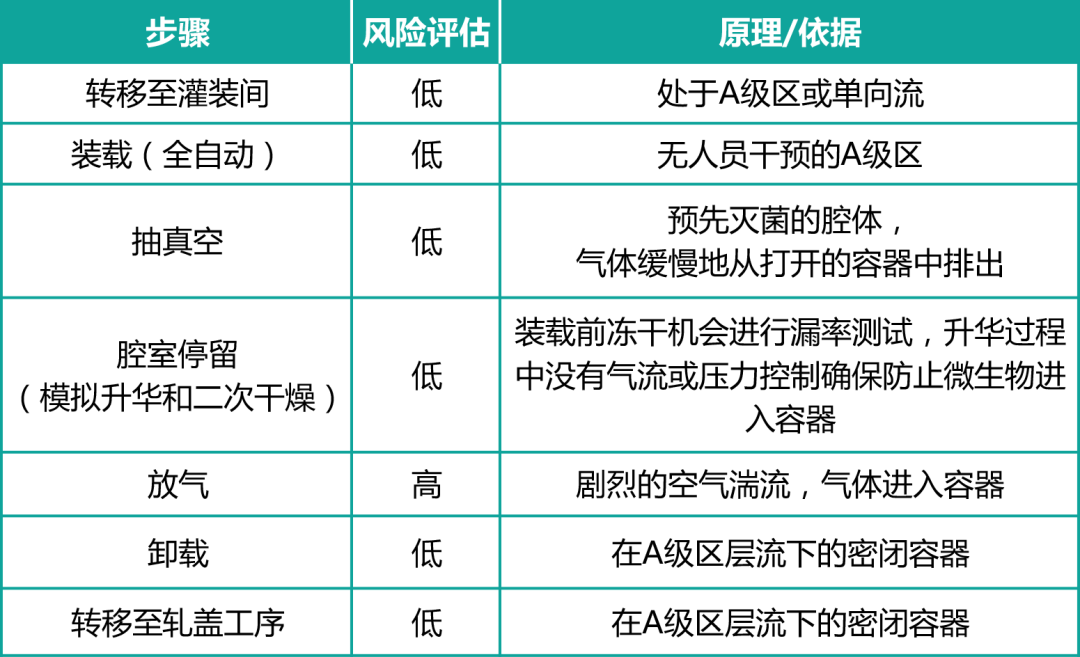 - 冻干产品的模拟过程应代表整个无菌工艺链,包括灌装、运输、装载、腔室停留、卸载和密封等。在各个链条下均能代表最差操作参数,且在合理的,有详细记录记载的条件下进行;无菌冻干生产各个链条的风险评估表详见下方(举例):