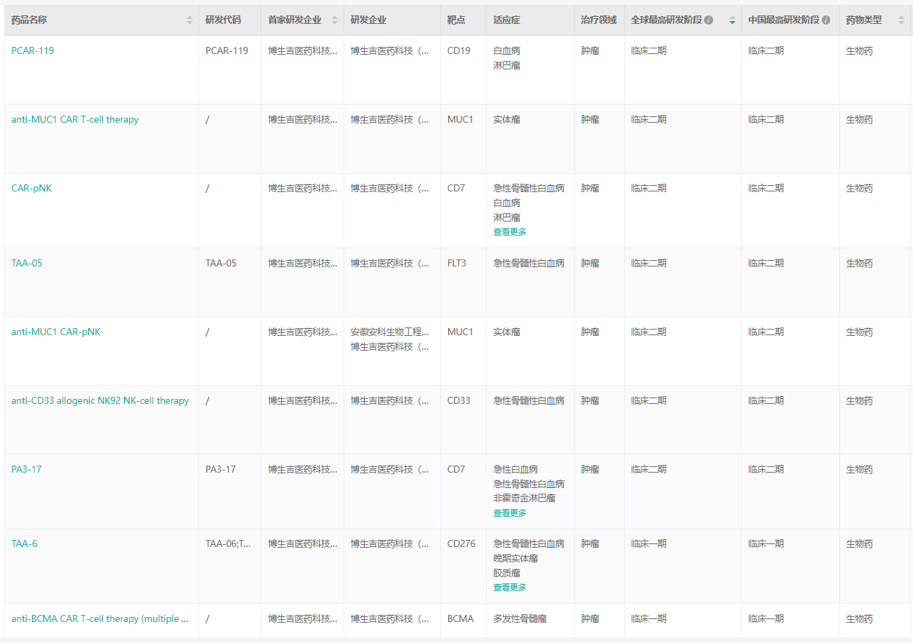 据药融云数据库查询,博生吉专注于肿瘤领域的药物研发,目前产品管线上有多个产品在同步进行紧锣密鼓地临床试验,多个细胞产品进入POC临床验证阶段,涵盖大部分血液肿瘤和部分实体肿瘤。