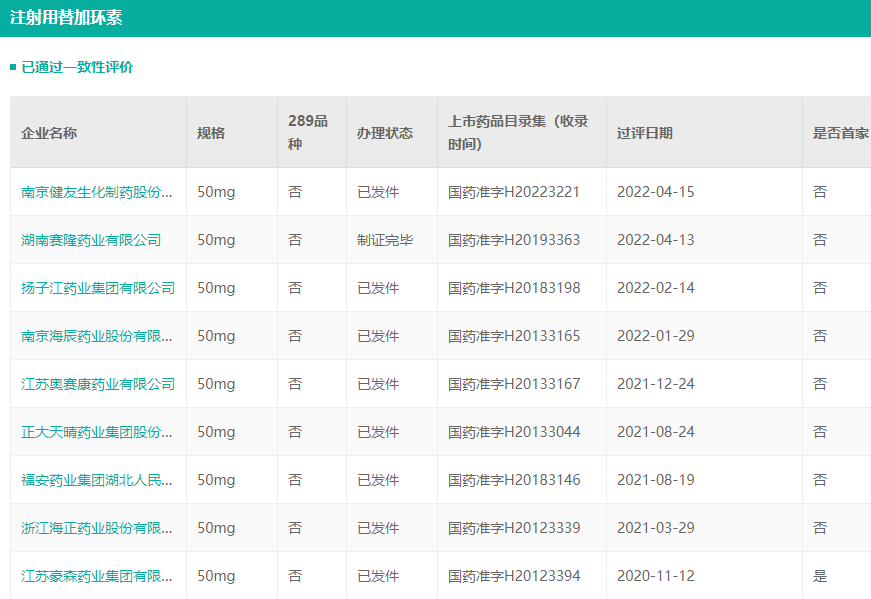 目前国内共有包括豪森药业(仿制药首家过评)、浙江海正药业、福安药业、正大天晴、奥赛康、南京海辰药业、扬子江药业、湖南赛隆和南京健友等共9家企业先后过评注射用替加环素,另有武汉启瑞药业递交了该品种的仿制药上市申请。