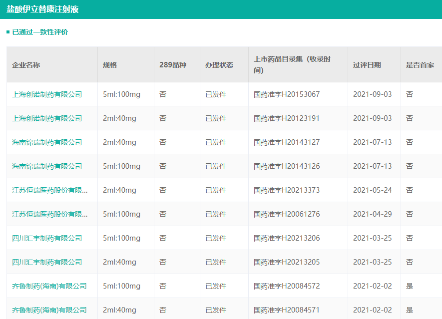 目前国内获批上市的伊立替康注射剂有3款,分别为盐酸伊立替康注射液、注射用盐酸伊立替康和盐酸伊立替康脂质体注射液,其中仅盐酸伊立替康注射液有企业过评,为齐鲁制药(仿制药首家过评)、四川汇宇制药、恒瑞医药、海南锦瑞制药和上海创诺制药等5家。