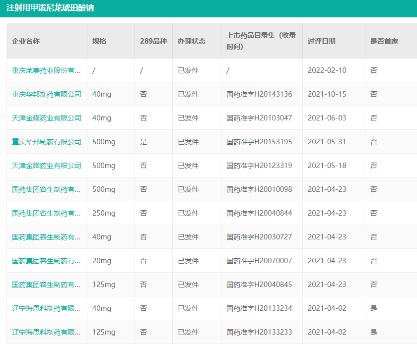 目前,已有辽宁海思科(仿制药首家过评)、国药集团、天津金耀药业、重庆华邦制药和重庆莱美药业已过评注射用甲泼尼龙琥珀酸钠。另有南光化学制药/杭州泰格医药、海南合瑞制药和福安药业递交了该品种的仿制药上市申请或一致性评价补充申请。