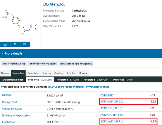 由上,当流动相的pH≤5.5时,阿替洛尔的logD的预测值≤-2.82,常规流动相体系中很难实现有效保留。为实现该化合物的有效保留,EP收录的测定法采用了在流动相中加入长链烷烃磺酸盐的办法,具体色谱条件如下: