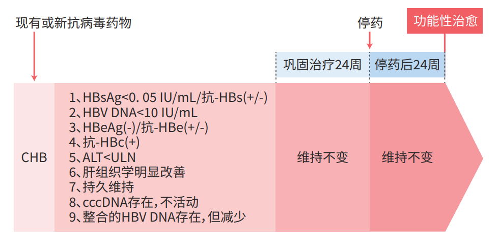 随着研究的不断深入,功能性治愈的定义逐渐完善,趋于标准化,在2023年和2024年进一步定义了临床可衡量的标准,以指导结局终点,即停止治疗后24周持续HBsAg<0.05 IU/mL,HBV DNA持续低于定量下限,HBeAg持续阴性,肝组织学改善。这一目标对患者生活质量和预后改善意义重大。随着新研究的不断开展,CHB功能性治愈的定义还在持续更新。