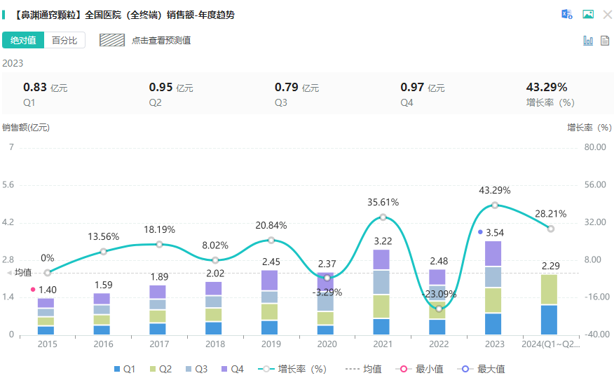 鼻渊通窍颗粒国内独家品种,为国家医保乙类药品,自2003年上市以来,临床疗效获得中西医临床专家的广泛认可。摩熵医药全国医院销售(全终端)数据库显示,在医院终端市场鼻渊通窍颗粒经历了2022年销售额急降后,2023年同比增长43.29%,销售规模超3.5亿元。2024年Q1~Q2的销售额为2.29亿元,同比增长28.21%。