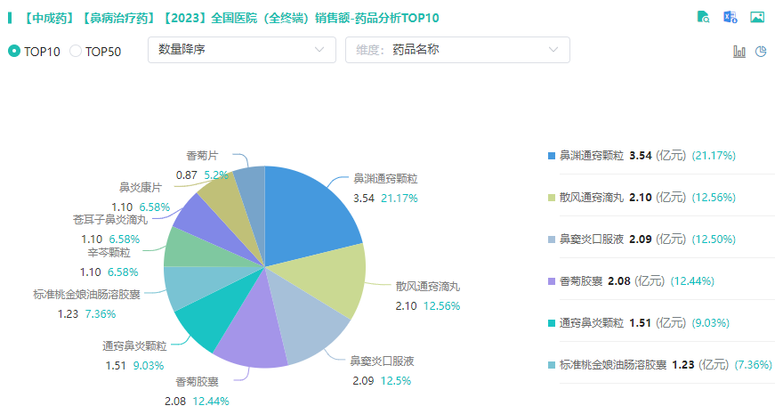摩熵医药医院全终端市场,2023年鼻病治疗中成药的销售额已超20亿元;TOP10产品中,鼻渊通窍颗粒位居榜首,占据21.17%的市场份额,其次是散风通窍滴丸(占比12.56%)、鼻窦炎口服液(占比12.50%)。