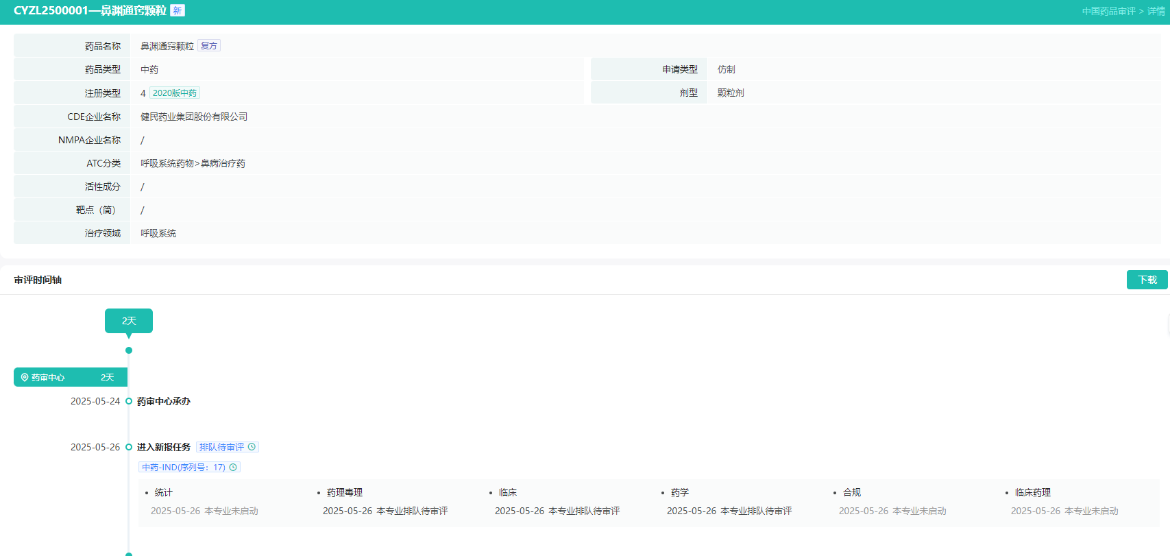 近年来,中药仿制药领域迎来发展热潮,众多企业纷纷布局赛道。据摩熵医药中国药品审评数据库显示,近日健民药业集团提交的鼻渊通窍颗粒的中药4类仿制临床申请获得药审中心承办(受理号:CYZL2500001)。