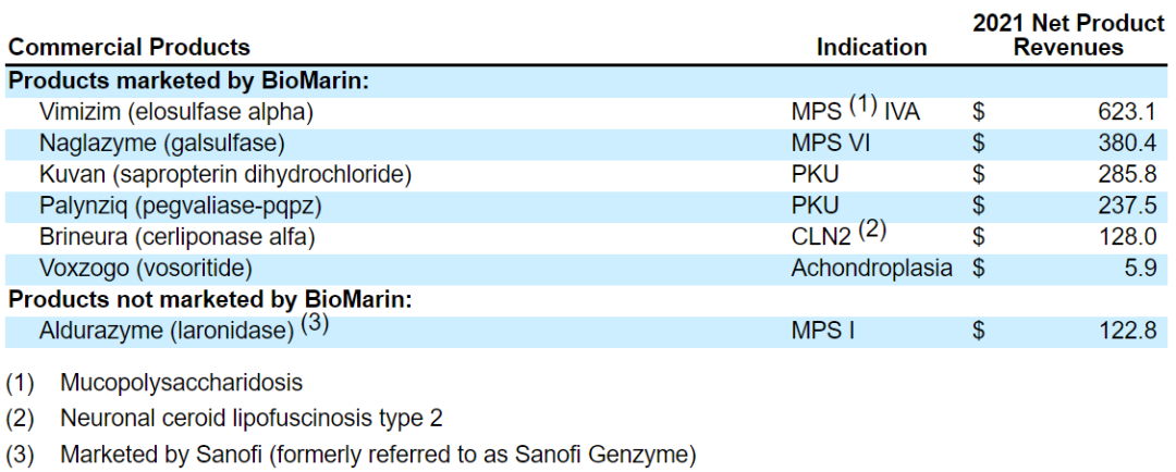 ·Aldurazyme(laronidase)是BioMarin第一个获批上市的药物,用于治疗黏多糖贮积症I型(MPSI),其本质是一款高度纯化的α-L-艾杜糖醛酸酶,已在美国、欧盟和其他国际市场获批上市。该药源于1998年BioMarin与健赞(现为赛诺菲的一部分)成立的合资公司,BioMarin与赛诺菲拥有50/50的权益。目前该药由BioMarin负责制造,并由赛诺菲进行销售,BioMarin将获得全球净销售额39.5%至50%不等的付款。