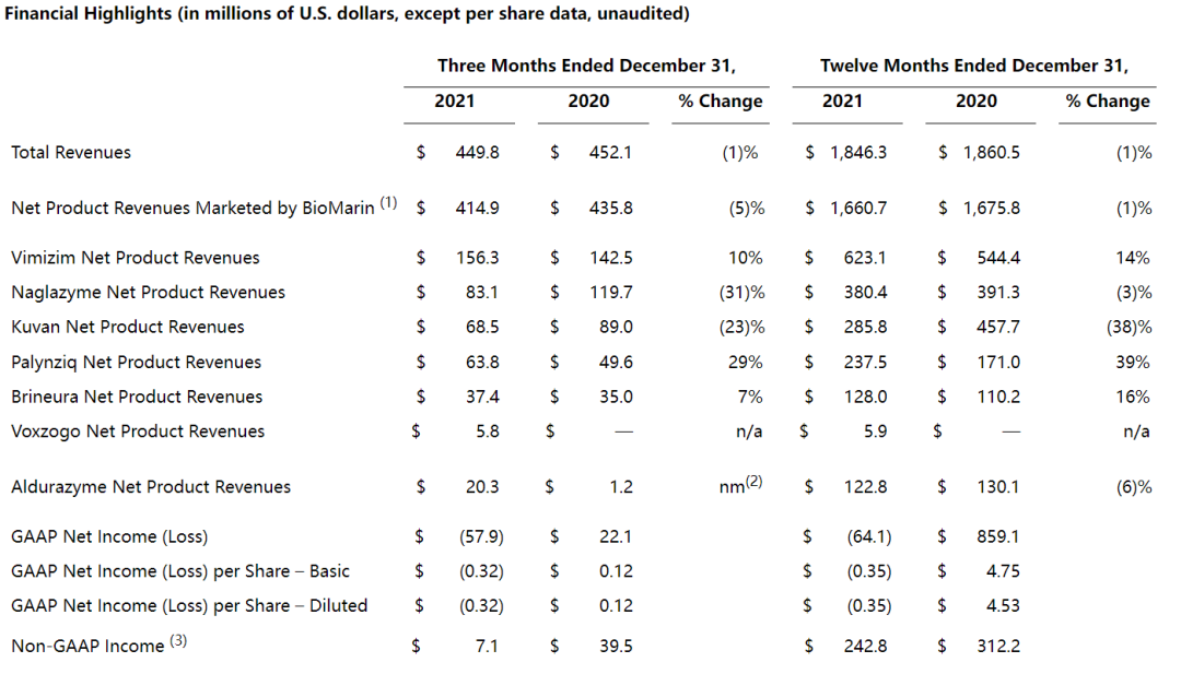 2021全年BioMarin总收入为18.463亿美元,同比减少1%,主要由于Kuvan(sapropterin dihydrochloride,盐酸沙丙蝶呤)在2020年10月专利到期,受仿制药竞争,该药2021年业绩同比减少38%,不过公司2021年总体收入稳定。随着Voxzogo(vosoritide,伏索利肽)分别在2021年第三季度和第四季度获EMA和FDA批准,商业销售工作也同时启动,这导致公司的销售、一般和行政费用增加,为7.594亿美元;公司全年研发支出6.288亿美元,与2020年持平;全年净亏损6408万美元。以下为BioMarin全年产品业绩分布: