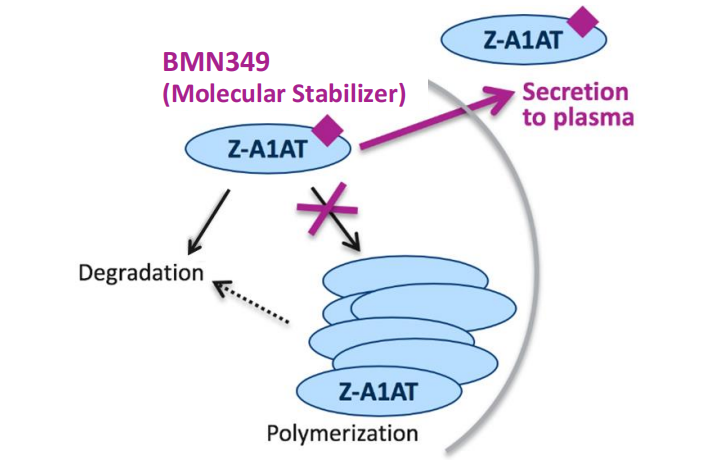 BMN349是一款在研的口服小分子药物,用于治疗α1-抗胰蛋白酶缺乏症,该病是由α1-抗胰蛋白酶(A1AT)缺乏引起的一种先天性代谢病,患者肝脏中A1AT蛋白累积,常导致新生儿肝炎,婴幼儿和成人的肝硬化、肝癌和肺气肿等。BMN349旨在下调A1AT蛋白在肝脏中的累积,小鼠模型显示,该疗法可减少肝脏中A1AT的累积,具有逆转肝脏损伤的潜力。公司预计将在2023年第三季度提交该疗法的IND申请。