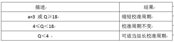 对计量器具的校准周期进行复评时,其复评结果有三种情况:缩短校准周期、校准周期不变、可适当延长校准周期。复评结果的判断见表7:计量器具的校准周期复评判断标准。