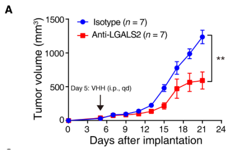 研究发现,不管是通过使用CSF1R拮抗剂pexidartinib(PLX3397)阻断LGALS2所调控的CSF1/CSF1R轴,还是利用llama-derived的抑制性抗体阻断LGALS2成功地阻止了肿瘤生长并逆转了免疫抑制。