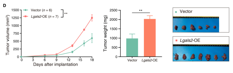 通过体外增殖试验和体内增殖试验,发现Lgals2在体外肿瘤增殖中没有先天功能(P > 0.05)。相比之下,过表达Lgals2的肿瘤在体内生长明显更快(P < 0.01)。