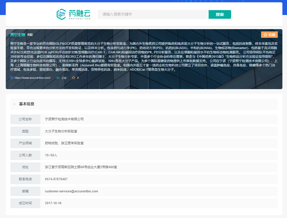 熙宁生物在宁波(熙宁生物)、上海(精翰生物)、和美国新泽西(Accurant Bio)都建有实验室,总面积超过6,500 平方米,科学家团队规模超过150人。已经和国内外近百家药企和生物科技公司建立了临床和临床前研究的项目合作,涵盖肿瘤免疫,自身免疫,降糖等多个热门治疗领域,包含蛋白药物,基因及细胞治疗药物等各类生物大分子,其中双特异性抗体>15个,基因和细胞治疗药物>28个,在研靶点>40个,临床试验>180个。熙宁生物成功支持了国内第一款一类新药的Car-T产品-药明巨诺倍诺达®(瑞基奥仑赛注射液)的上市。