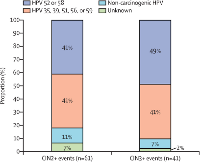 在疫苗组中的61起CIN2+事件中,由HPV52或58引起的比例为41%(25起),并且疫苗组发生了41起CIN3+事件,由HPV52或58引起的比例为49%。