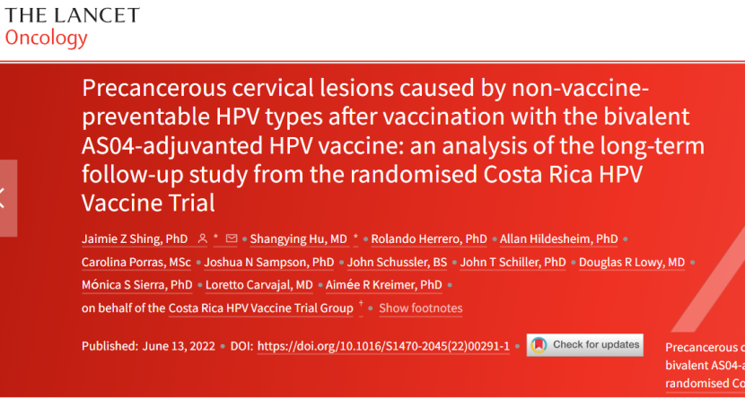 [1] 《柳叶刀》子刊 Precancerous cervical lesions caused by non-vaccine-preventable HPV types after vaccination with the bivalent AS04-adjuvanted HPV vaccine: an analysis of the long-term follow-up study from the randomised Costa Rica HPV Vaccine Trial