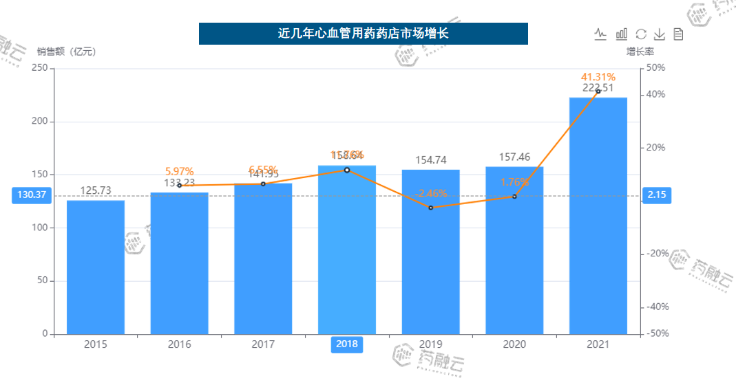 根据药融云零售药店数据库数据显示,2015-2020年我国心血管用药在药店市场的销售呈缓慢增长趋势,2021年出现大幅攀升,销售额达到222亿元,同比增长41.31%。