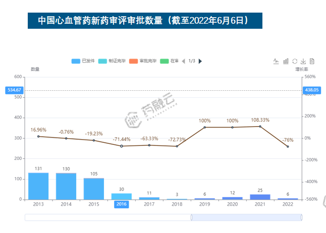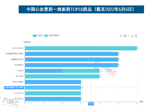 - 截至2022年6月6日,中国共承办3030个心血管新药,其中注册类型为1类新药的仅99个
