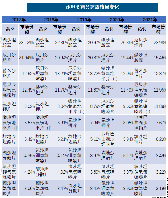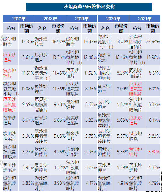 - 厄贝沙坦片、氯沙坦钾片和厄贝沙坦氢氯噻嗪片是进入第一批集采的产品,2017-2021年在医院市场的排位和份额均有不同程度的下滑。缬沙坦胶囊2017-2019年都霸榜第一,缬沙坦氨氯地平片(I)2020年顶替成为榜首,沙库巴曲缬沙坦钠片2021年又跃居第一。