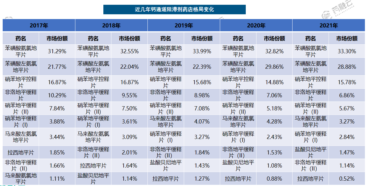 苯磺酸氨氯地平片是第一批集采产品,但是在药店销售中一直稳守第一的位置,市场份额一直处于30%以上。苯磺酸左氨氯地平片也常年位居第二,且市场份额一直在慢慢提高,2021年相比2017年已涨幅7%。