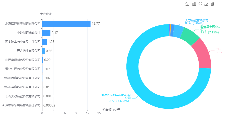 - 北京四环科宝制药的尼可地尔是所有产品中的佼佼者,销售遥遥领先于其他企业
