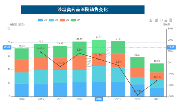 - 通过药融云医院数据,我们发现,沙坦类产品在2018年销售额达到最高峰后,近三年市场规模在逐渐缩小。