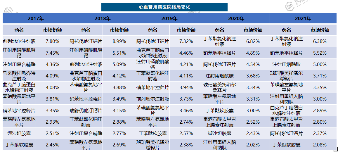 - 产品排名变化较大,阿托伐他汀钙片从2019年的首位跌至2021年的第九;注射用磷酸肌酸钙、前列地尔注射液、注射用复合辅酶等前几年都榜上有名且名列前茅,但近几年都名落孙山,跌出榜单。