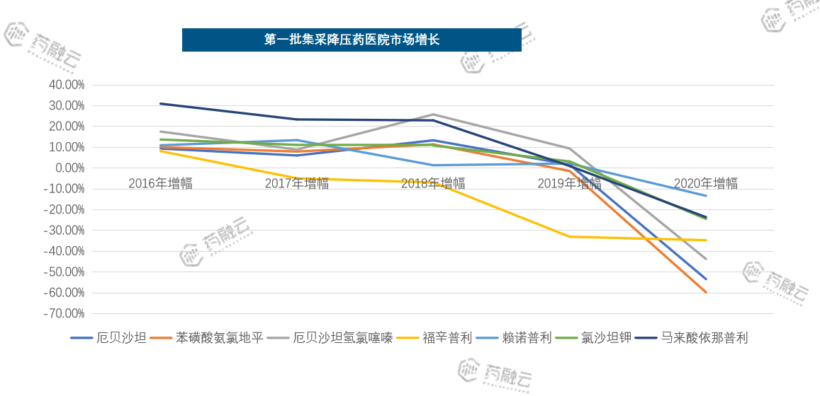 根据药融云全国医院销售数据显示,集采第一批降压药共有7个品种,在医院销售均有不同幅度的下降。其中,以厄贝沙坦和苯磺酸氨氯地平降幅最大。