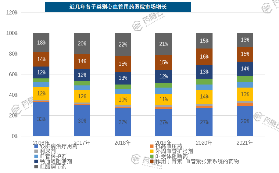 心血管化药共有9个子类别,通过药融云医院销售数据显示,心脏病治疗用药的占比最大,在30%左右。钙通道阻滞剂虽然占比不大,但销售占比在逐年扩大。