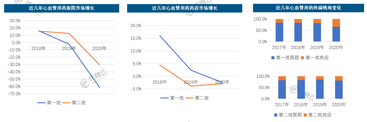 - 医院市场:第一批集采中标的心血管药物共有9个,年度销售增长呈现下滑态势,第二批由于实施的时间晚于第一批,因此在2020年销售降幅较大。