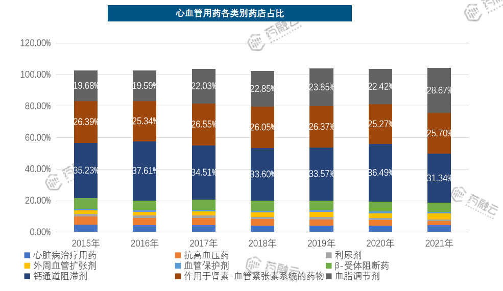 据统计,在药店心血管用药中,钙通道阻滞剂占比最大,但2021年市场份额下降超5个百分点,取而代之的是血脂调节剂占比有所上升。