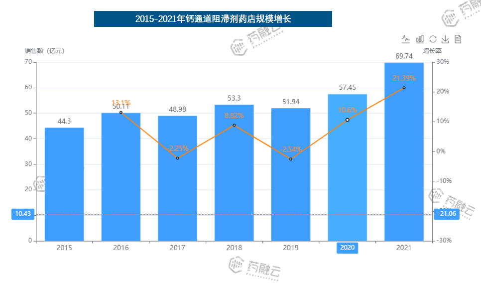 根据药融云药店零售数据库显示,近几年钙通道阻滞剂在我国心血管用药的药店市场销售规模较为稳定,且总体处于上升趋势,且2021年涨幅最大,同比增长21%,达到近70亿元。