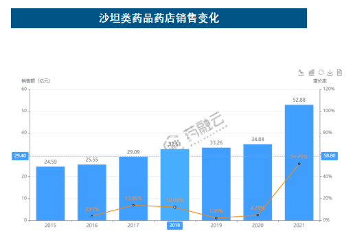 - 通过药融云零售药店数据库显示,沙坦类产品在零售药店市场于2021年销售额涨幅最大,达到52.88亿元,同步增长51.75%。