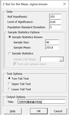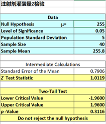 同理,该问题可以转换为单样本双尾检验,总体标准差已知,选择Z检验,原假设H0:灌装量μ=255,备择假设H1:灌装量μ≠255