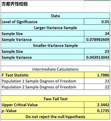结果显示,P-value=0.1735>0.05,具备方差齐性。