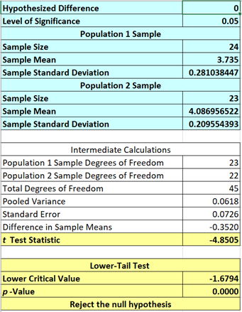 P-value<0.05,拒绝原假设,选择备择假设,即μ1<μ2。