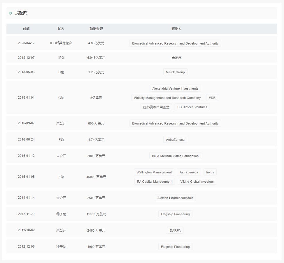Moderna公司从2012年开始经过五轮融资,共募集到超过21亿美元。